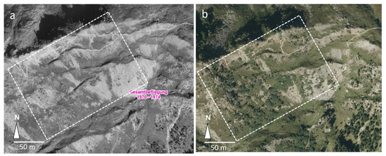 Example plot showing the spread of green alder (Alnus alnobetula) within the treeline ecotone on Mt. Patscherkofel. Orthophotos were taken in 1974 (a) and 2019 (b); elevation range: c. 2100–2200 m asl. The marked rectancle includes stands that were sampled in this study. Source: Orthophoto Land Tirol, tiris (https://lba.tirol.gv.at/public/karte.xhtml; 24 February 2022, and https://maps.tirol.gv.at/; 24 February 2022).