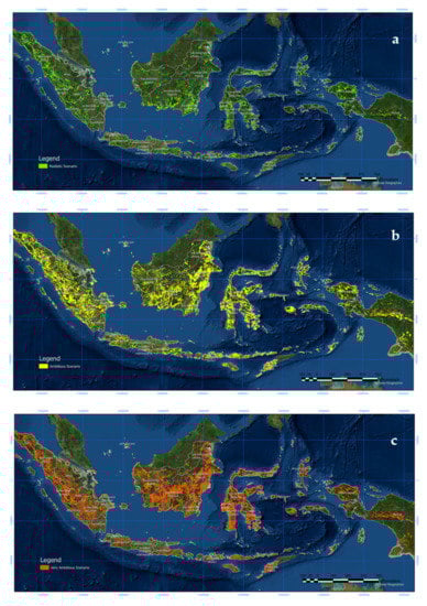 Map of reforestation opportunities in Indonesia based on (a). Realistic (bright green, above); (b). Ambitious (bright yellow, middle); and (c). Very Ambitious (bright orange, below) scenarios.