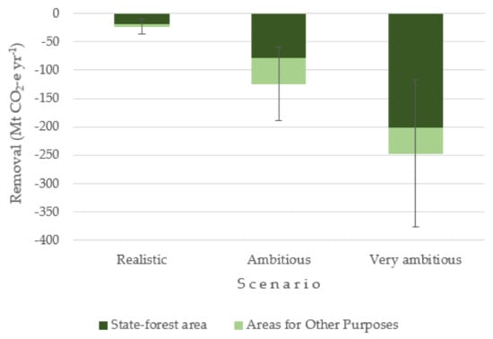 Taking into account the difference between the potential for carbon sequestration and the historical absorption value (−5.9 million tons of CO2e; [17]), reforestation activities during 2019–2030, based on the realistic, ambitious, and very ambitious scenarios have the potential to reduce carbon emissions by −17 MtCO2e yr−1, −118 MtCO2e yr−1 and −241 MtCO2e yr−1, respectively (Figure 5).