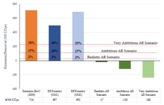 The potential for carbon removal from reforestation activities during 2019–2030 based on an ambitious scenario is −1353 MtCO2e or an average per year of −124 Mt CO2e, while based on the very ambitious scenario, the potential to sequester carbon is −2716 MtCO2e or an annual average of −247 MtCO2e (Figure 3).