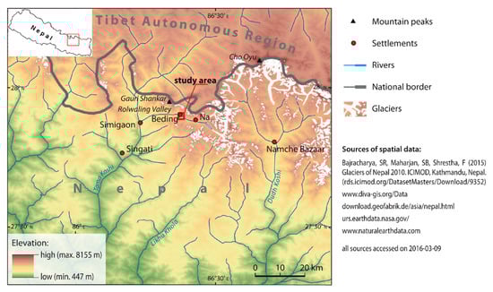 - Schickhoff, U.; Bobrowski, M.; Böhner, J.; Bürzle, B.; Chaudhary, R.P.; Müller, M.; Scholten, T.; Schwab, N.; Weidinger, J. The treeline ecotone in Rolwaling Himal, Nepal: Pattern-process relationships and treeline shift potential. In Ecology of Himalayan Treeline Ecotone, Singh, S.P., Reshi, Z.A., Joshi, R., Eds.; Springer: Singapore, 2022; in press. [Google Scholar]