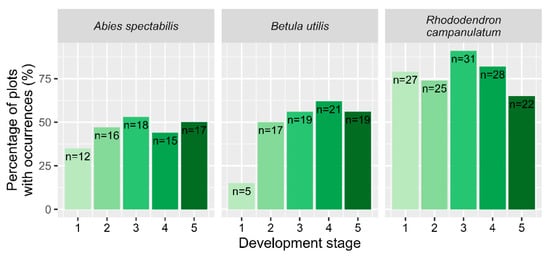 Percentage of plots with occurrence of the target species’ development stages (1: smallest seedlings, 5: adult trees). Numbers on bars show basic plot counts (total number of plots: n = 34).