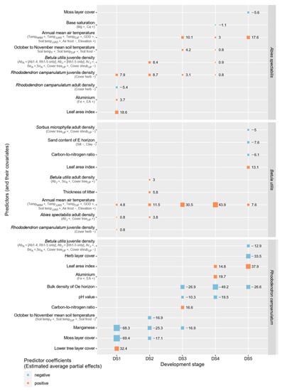 Various variables, which characterized vegetation layers’ cover and occurrence of competing tree species, contributed significantly to predictions of tree densities of all species and nearly all development stages. Juvenile Rhododendron individuals and/or the correlated cover of the herb layer had positive effects on development stage 1 density of Betula and all Abies development stages except stage 5. Densities of development stages 2 and 4 of Abies were predicted by Betula recruit density with positive effect. Various variables correlated to this predictor, i.e., juvenile Abies and Acer individuals, adult Abies, Betula and Sorbus trees, and cover of shrub and tree layers could potentially perform in a similar way. In addition, Betula recruit density contributed significantly and with negative effect to the Rhododendron development stage 5 model. The density of adult Abies trees was included in the Betula development stage 1 and 2 models, while density of Betula adult trees was important for the Betula development stage 2 model only (all positive effects). Both last-mentioned predictors correlated to other potential predictors, and amongst others, juvenile Abies individuals’ density. The leaf area index variable was significant for models of development stages 4 and 5 of Rhododendron, stages 1 of Abies and 5 of Betula (all positive effects). Please see Figure 3 for further predictors and their effects.
