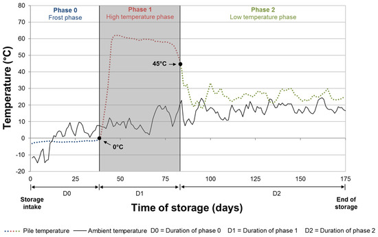Due to the harvesting of SRC in winter, in some regions like central or northern Europe, the ambient temperature is below 0 °C for some weeks, and therefore the temperature in the storage pile stays, as well, below 0 °C [17,21,26]. This first storage phase is called ‘frost phase’ in the three-phase model by Idler et al. [19] (Figure 1; phase 0), and it lacks the microbial activity that contributes to DML of the wood chips [17,21,26].