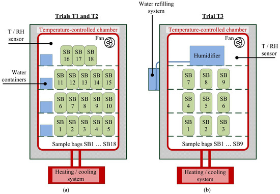 Storage of sample bags in a chamber under controlled temperature and assisted humidity. (a) Set-up used in trials T1 and T2 with water containers placed in the chamber, and (b) set-up using a humidifier in trial T3. T: temperature; RH: relative humidity; SB: sample bag.