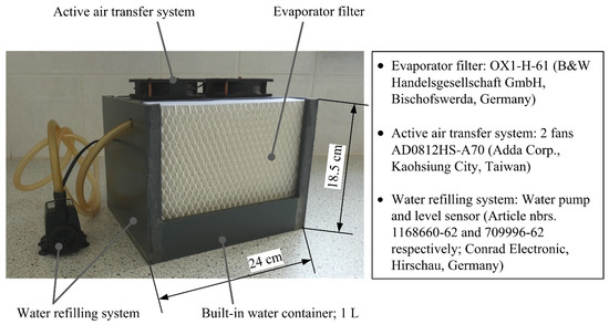 Two storage set-ups were evaluated in order to assist in having a high humidity atmosphere inside the chamber, comparable to the moisture conditions in outdoor piles. In the trials T1 and T2 (Table 1), four containers with distilled water placed inside the chamber were used (Figure 2a). In the alternative set-up, trial T3, we used an in-house developed humidifier (Figure 2b). This humidifier was actively transferring moisture to the chamber atmosphere, and was equipped with a water refilling system to assure a sufficient water supply (Figure 3). An Almemo ZA 9020-FS Thermo R2E4 sensor was used in the trials to measure the temperature inside the storage chamber, and the relative humidity (RH) was measured with Almemo FHAD36RAS (trials T1 and T2) and Almemo FH0D46C sensors (trial T3), together with an Almemo 3290-8 datalogger. The sensors and the datalogger were manufactured by Ahlborn Mess-und Regelungstechnik (Holzkirchen, Germany).