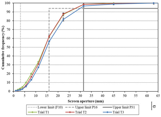Figure 4 shows the particle size distribution of the poplar chips used in each of the storage trials T1, T2 and T3 (Table 1), which complied with the wood chip class P31 according to EN ISO 17225-1:2014 [53]. The analysis of the particle size distribution showed no significant differences for the wood chips used for the trials T1–T3.