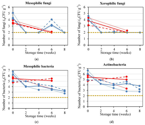 The results of the microbiological analyses done in the storage trials T1 and T2 (Table 1) are shown in Figure 5a–d, corresponding to mesophilic fungi, xerophilic fungi, mesophilic bacteria and actinobacteria, respectively. Detailed numerical values are presented in Appendix B (Table A4 and Table A5).