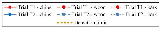 Table 3 shows the results of the ash content and elemental analyses of the poplar chips of storage trials T1–T3, and the complete dataset of the elemental and ash analyses is shown in Appendix C (Table A7).