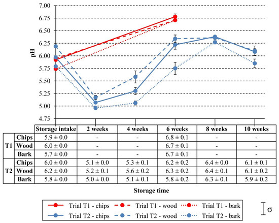 The pH data of wood chips as a function of storage trials (T1 and T2) and time (0–10 weeks); presented as mean (n = 2 and n = 3 for the storage intake and storage times, respectively) ± standard deviation.