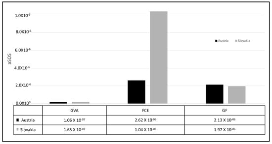 At a value chain level (Figure 3), a similar trend in terms of aSOS differences is seen between the downscaling methods. However, for the GF method the difference between the countries is significantly reduced. These results show how the value chain production volumes have a higher influence for Slovakia (3.00 × 10−1) than for Austria (9.41 × 10−2). For the FCE at value chain level, the largest aSOS is for Slovakia (2.62 × 10−6). Similarly, for the GVA at value chain level the highest aSOS is given to Slovakia.