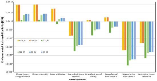 Next, the environmental impact outcomes were assessed against the downscaled PB by estimating the ESR (Equation (1)) for each impact category. Figure 4 presents the results of the ESR calculation (SM2) for the Austrian and Slovakian case study at a value chain level. Moreover, three downscaling methods, such as GVA, FCE, and GF are compared for each case. The results that are above a ESR of 1 are those that overpass the aSOS, thus being considered not environmentally sustainable.