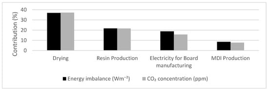 For both cases the impact categories that severely transgressed the ESR were those of CC-EI and CC-CO2. To identify the processes that contribute the most to these impact categories, Figure 5 presents a summary of the LCA results for those processes that provide more than 5% to the CC-EI and CC-CO2 categories. For both indicators the highest impacts are due to the drying process, the resin and MDI production, and the electricity consumed during the board manufacturing. Following are the pine wood transportation and poplar wood from SRC production.