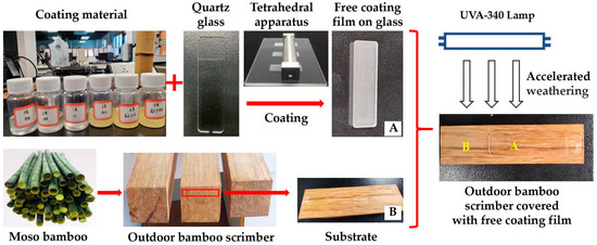 Bamboo is a widely used sustainable building and construction material possessing an attractive natural color and beautiful texture. Bamboo has a high strength-to-weight ratio and can be processed easily [1,2,3]. Bamboo is abundant and cultivated in different regions around the world. In particular, bamboo plantations comprise around 32 million hectares in total with 4 million hectares in China [4]. Bamboo scrimber is one of the main bamboo products and is obtained by crushing bamboo culm into fibers and pressing them into the required shape. However, when bamboo scrimber is used outdoors, environmental factors, such as solar radiation, moisture, oxygen, and high temperature cause discoloration and loss of glossiness [5,6]. Furthermore, weathering causes bamboo scrimber to lose strength, split, become rough, and exhibit chalking [7]. Solar radiation, specifically ultraviolet (UV) radiation, is the main contributor to the degradation process (Figure 1) [8,9,10]. Therefore, it is essential to develop UV-radiation-resistant coatings for outdoor bamboo scrimbers (OBSs).
