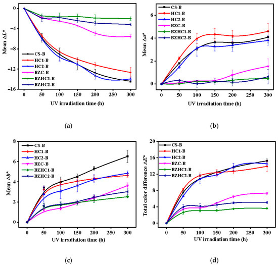 The color changes in OBS are related to chemical changes, such as the degradation of bamboo lignin. The color changes in response to UV irradiation of the surfaces of the OBS coated with different films are shown in Figure 3. UV exposure has a great influence on the color of CS-B, HC1-B, and HC2-B, and it has an obvious darkening tendency (Figure 3a), reddening (Figure 3b), yellowing (Figure 3c), and the total color difference increased (Figure 3d). The colorimetric parameter L* (lightness) of all samples shows a decreasing tendency with the extension of irradiation time, indicating that UV exposure leads to the gradual darkening of the OBS surface [38]. The largest change in L* after 300 h of weathering was observed in sample CS-B (−14.42) without coating, followed by samples HC2-B (−13.94) and HC1-B (−12.67). These results suggest that the lightness of OBS without protection is susceptible to photodegradation and coating with a light stabilizer alone cannot significantly improve the lightness stability of OBS. The smallest changes in L* were obtained by sample BZHC1-B (−2.01), followed by BZHC2-B (−3.17) and BZC-B (−5.54). This indicates that the stereoscopic protective coatings were successful in promoting the lightness stability of OBS. Both BZHC1-B and BZHC2-B exhibited better performance in L* stability than BZC-B after exposure. The combined application of UV absorber and HALS promoted the lightness stability of OBS.