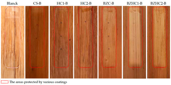 Photos of the blank sample without exposure and weathered samples are presented in Figure 4. The covered area is the area between the red dashed lines, and the intuitive presentation results are consistent with the colorimetric parameter investigation. The photochromism of sample CS-B was remarkable, and there was no obvious boundary between the covered and uncovered areas. The photochromism of samples HC1-B and HC2-B was more pronounced than that of the blank sample. However, the covered area of BZC-B, BZHC1-B, and BZHC2-B exhibited good behavior after exposure, and a noticeable difference was observed between the covered and exposed areas.