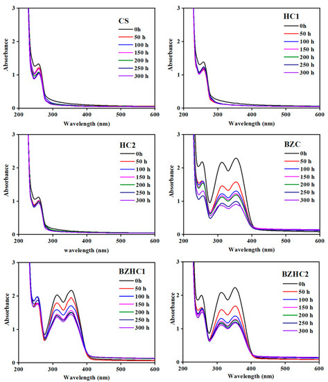 Figure 5 shows the UV-Vis spectra of free films after exposure which were used to evaluate the changes in the UV shielding performance of free films during weathering. All curves exhibited lower absorbance in the visible light region and higher absorbance in the UV light region. The UV absorption of samples CS, HC1 and HC2 were stable in the 200–280 nm range. The absorption peak of acrylic resin appeared at 258 nm, indicating that it is useless for the anti-photodegradation of outdoor wood and bamboo [44]. Samples BZC, BZHC1, and BZHC2 also showed stronger UV absorption in the 280–400 nm region, and two obvious absorption peaks appeared at 312 nm and 354 nm, indicating that the free films provided effective UV shielding for the substrate [45]. The UV absorbance of all samples showed a decreasing tendency with the extension of irradiation time, suggesting that the chemical structure of free films could be destroyed by exposure to UV, resulting in the loss of UV shielding capability. The UV absorbance values of samples CS (1.33), HC1 (1.38), and HC2 (1.22) at 258 nm were slightly different before exposure, indicating that the addition of HALS did not significantly improve the UV shielding performance of the coating. The highest UV absorbance values at 312 nm and 354 nm without weathering were observed in samples BZC (2.17, 2.29), followed by BZHC2 (2.08, 2.22) and BZHC1 (2.03, 2.17). The BZC sample also showed the greatest change in UV absorbance values at 312 nm (−0.87) and 354 nm (−0.90) after 300 h of weathering, and the peak absorbance values decreased by 59.90% and 60.00%, respectively. This indicates that the UV absorber (BTZ) was easily degraded and lost its ability to absorb UV light during weathering. However, the loss rate of UV light absorbance values of free films was reduced after the addition of HALS, and the peak absorbance values of the BZHC1 and BZHC2 samples decreased by 32.40% and 33.20% (peak at 312 nm) and 46.70% and 47.30% (peak at 354 nm), respectively, after weathering. This verifies that the stereoscopic protective coating with added HALS improved the stability of the UV shielding. HALS absorbed free radicals and interrupted the photodegradation reactions in the free film [46].