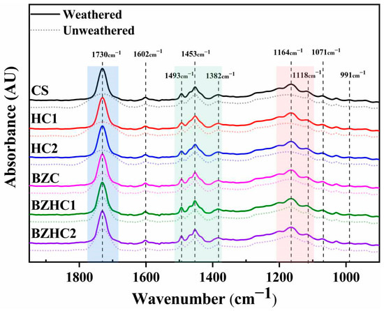 The unweathered CS samples were almost completely pyrolyzed when the treatment temperature was 800 °C, and the pyrolysis residue was 0.07% (CS). The pyrolysis residues of the unweathered samples with added HA1 and HA2 increased to 0.16% (HC1) and 0.52% (HC2) compared to the unweathered CS samples, indicating that HALS contains structures that are not easily pyrolyzed. The pyrolysis residues of unweathered samples of BZC (2.60%), BZHC1 (2.18%), and BZHC2 (1.41%) were markedly increased compared with the unweathered samples of CS, HC1, and HC2, which was attributed to the addition of NZnO that is not pyrolyzed at 800 °C. The pyrolysis residue of weathered samples was greater than that of unweathered samples, suggesting that many components that were difficult to pyrolyze were produced during photodegradation [53]. The changes in the pyrolysis residues of the samples after weathering are listed in Table 4. The regular changes were similar to those in the above investigation. The largest change in the pyrolysis residue was obtained in sample CS (5.86%), followed by samples HC1 (5.06%) and HC2 (3.59%). The smallest change in pyrolysis residues was observed in sample BZHC1, suggesting that the stereoscopic protective coatings reduced the production of components that were not easily pyrolyzed, and increased the photostability of the coating when exposed to solar radiation [54].