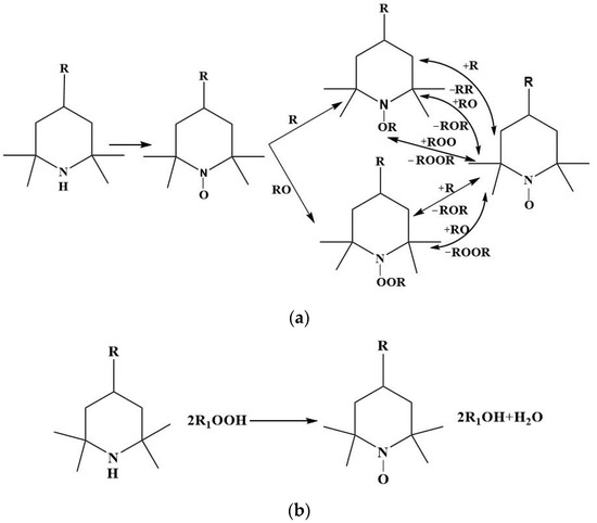 (a) The action mechanism of HALS capturing free radicals; (b) The mechanism of HALS in peroxide decomposition.