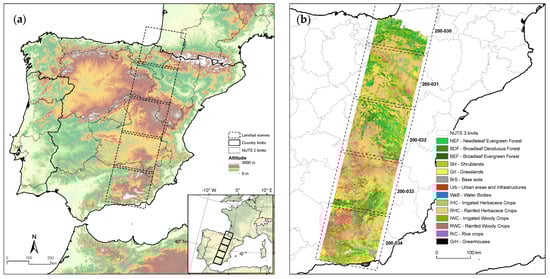 The study area corresponds to a transect of around 185 km wide and 755 km long crossing north–south of the IP and covering 120,190 km2 (Figure 1). The transect allows us to study an important bioclimatic gradient where both the Eurosiberian and the Mediterranean biogeographical regions are represented []. The south Mediterranean context is characterized by dry conditions where the higher mean annual temperature (19 °C) and the lowest annual rainfall (150 mm) occur, evolving into continental regimes towards the center of the IP. In contrast, more humid and mountainous climatic regimes characterize the North Eurosiberian region, where the lowest mean annual temperatures (2 °C) and the highest annual rainfall (over 2200 mm) are reached. Figure S5 in the Supplementary Materials provide details about the topoclimatic variation along the transect.