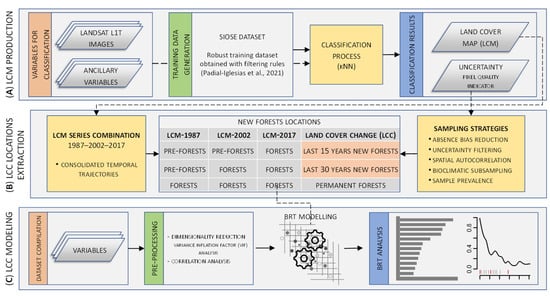 Methodological workflow. LCM processing (A) provided three temporal thematic maps and their associated uncertainty layers. In (B), locations of forest expansion from crops, shrublands, and grasslands (pre-forests) were extracted considering sampling strategies. Boosted regression trees (BRTs) were used to analyze the drivers involved (C) in NF occurrence.