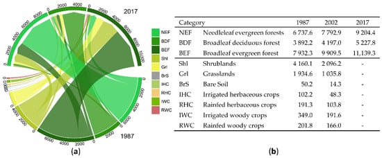 (a) Chord diagram showing NF trajectories between 1987 and 2017 in the whole transect. (b) Table detailing the occupation of each category implied in NF consolidated trajectories. All figures are shown in km2.