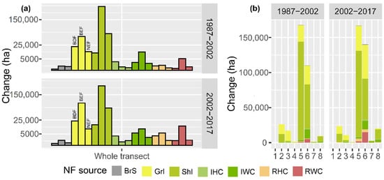 (a) NF transitions change area by source category and forest type for the whole transect. Colors denote source categories (e.g., yellow = grasslands), while the three consecutive bars represent each target forest (BDF, BEF, and NEF). (b) NF transition area disaggregated by BR, referenced by the numbers in Table 1.