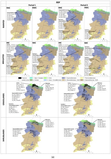 Studies of forest expansion associated with cropland abandonment dynamics in mountainous regions have been reported at the European ambit [,,,,,,,]. In our results, the appearance of new BDF from crop categories was closely associated with the proximity to rivers, streams, or torrents, where water availability and humidity allows BDF species to grow. Similarly, their expansion is associated with irrigated crops, and is also favored by the proximity to forested areas, producing a fulfilling process between or within the forested patches (small or isolated cultivated areas) or along their edges, where seed dispersal triggers early stages of natural succession []. Regarding the spatio-temporal behavior, new BDF from crops mainly appeared in large hydrographic basins close to hydrographic network (Northern and Southern Mesomediterranean BRs) and in the transitions to mountainous areas (Supramediterranean) where croplands are less competitive [,,], affecting specially rainfed crops in our results.