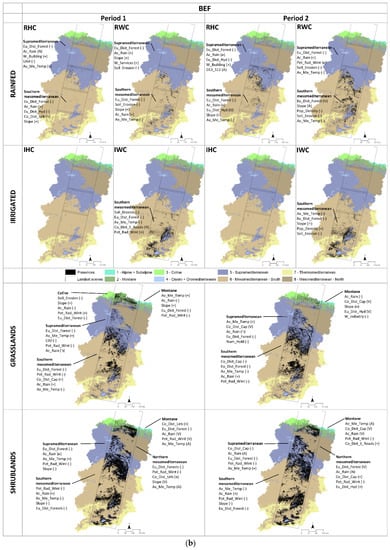 Compared to BDF and BEF, socioeconomic drivers were significant in the Southern Mesomediterranean BR, where new NEF appearance was more prone in areas with a low number of holdings. This fact is interpreted as the lower availability of agriculture holdings in the upper limit of the BR, far from provincial capitals and main roads. In addition, remoteness and climatic constraints reduce the productivity of the land, increased by uncertainty in the regularity of rainfall, making farmers more likely to make decisions aimed at abandoning land [,,]. Finally, a positive trend related to livestock units has been observed, a totally new contribution up to our knowledge.