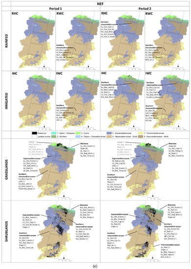 In the case of new NEFs from crop abandonment processes, the distance to provincial capitals, forests, and secondary roads predominated in all the BRs involved. Moreover, the number of holdings and the livestock units dominated in the southern region, and the distance to the hydrographic network dominated in the northern region. Regarding the spatio-temporal behavior, new NEFs from crops appeared in the Northern and Southern Mesomediterranean BRs, areas characterized by dry conditions, where NEF species (e.g., Pinus halepensis Mill., Pinus pinaster Aiton, Pinus pinea L., and Pinus nigra J.F.Arnold) are better adapted to lower water requirements.