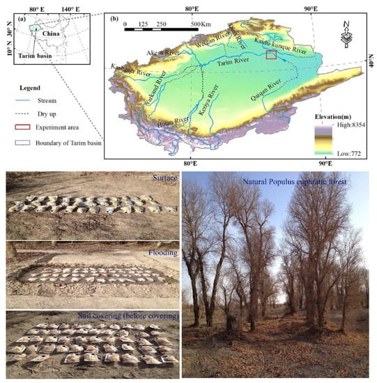 The desert riparian forest is an important vegetation type for inland river valleys in arid zones, forming a natural ecological barrier to protect oases’ development, stabilizing river course, maintaining the ecological balance of river basins, and facilitating the formation of fecund forest soil [,]. In natural ecosystems, disturbances frequently come from regime shifts such as fire or flooding cycles. Riparian zones in floodplains are occasionally or periodically disturbed by flood events. This disturbance, of which the timing, frequency, intensity, and duration are determined by a flow regime, greatly influences reproduction, survival, growth, community structure, and even patterns of riparian vegetation [,]. P. euphratica Oliv., as a predominant species in desert riparian forest ecosystems, is found in the arid and semi-arid deserts of Mid-Asia []. China possesses the largest range and number of P. euphratica, which comprises 61% of the global P. euphratica forest []. Moreover, the natural P. euphratica forest in the Tarim River Basin, Xinjiang, accounts for 54% of the global and 89% of China’s P. euphratica area []. In the lower reaches of the main channel of the Tarim River, the regeneration and conservation of desert riparian P. euphratica forest are primarily affected by disturbances of river flooding and groundwater level rise along the main channel of the Tarim River []. In the lower reaches along the main channel of the Tarim River, the P. euphratica forest could be regularly disturbed by flooding prior to 1970. From 1970–2000, however, it could not be disturbed by flooding because the lower reaches along the main channel of the Tarim River dried up beginning in the 1970s. After 2000, flooding disturbances may occur during water delivery to the lower reaches along the Tarim River. The water delivery was an integrated plan involving water delivery to the lower reaches along the river to prevent continued deterioration of desert riparian forest along the main channel of the Tarim River []. The duration and frequency of the flooding are variable, the duration ranging from an instant to several days and the frequency ranging from one or more times, depending on the amount of water and period of water delivery in the lower reaches along the main channel of the Tarim River. Since 2000, water delivery has been carried out one or two times a year from March to April or August to November annually depending on the amount of water in the source flow, and transient flooding from seconds to hours represents a more common disturbance for riparian forests during water delivery in the lower reaches along the main channel of the Tarim River. High soil moisture caused by flooding, which constitutes 10–30 d of inundation, is conducive to decomposer community composition, microbial activities via changes in other abiotic or biotic conditions [], and promotes decomposition of organic matter [] and water-soluble salt in leaves dissolved by flooding []. However, what effects will transient flooding have on leaf litter mass loss and leaf litter stoichiometry during decomposition?