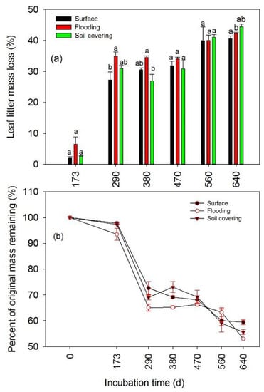 Changes of rate of leaf litter mass loss (a) and percent of original mass remaining (b) over incubation time. Within each graph, histograms with the same letter indicate that the value was not significantly different (p < 0.05). Surface: litterbags placed on the ground (no disturbance); flooding: litterbags fixed on the ground and immersed in water for 5 h; soil covering: litterbags covered with soil. Vertical bars indicate the standard error of the mean (n = 3).