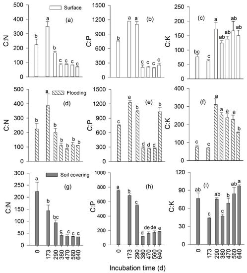 Dynamic of leaf litter C, N, P, and K stoichiometry over incubation time in three treatments. Within each graph, histograms with the same letter indicate that the value was not significantly different (p < 0.05). Surface: litterbags placed on the ground; flooding: litterbags fixed on the ground and immersed in water for 5 h; soil covering: litterbags covered with soil. Vertical bars denote the standard error of the mean (n = 3); (a–c): Surface treatment; (d–f): Flooding treatment; (g–i): Soil covering treatment.