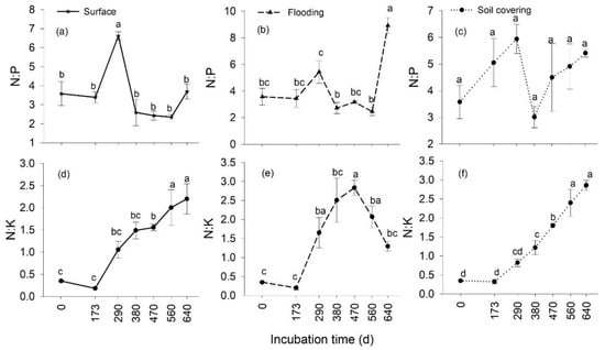 Dynamic variations of N:P ratio and N:K ratio with incubation time in three treatments. Within each graph, lines with the same letter indicate that the value was not significantly different (p < 0.05). Surface: litterbags placed on the ground (a,d); flooding: litterbags fixed on the ground and immersed in water for 5 h (b,e); soil covering: litterbags covered with soil (c,f). Vertical bars denote the standard error of the mean (n = 3).