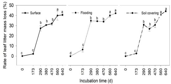 Dynamic variations in rate of leaf litter mass loss and percentage of original mass remaining in three treatments during incubation. Difference letters denote significant differences among treatments at the same incubation time at p < 0.05. Surface: litterbags placed on the ground; flooding: litterbags fixed on the ground and immersed in water for 5 h; soil covering: litterbags covered with soil. Vertical bars denote the standard error of the mean (n = 3).