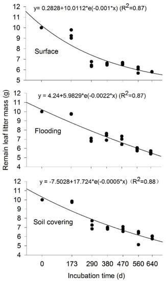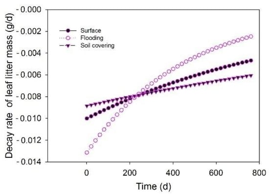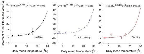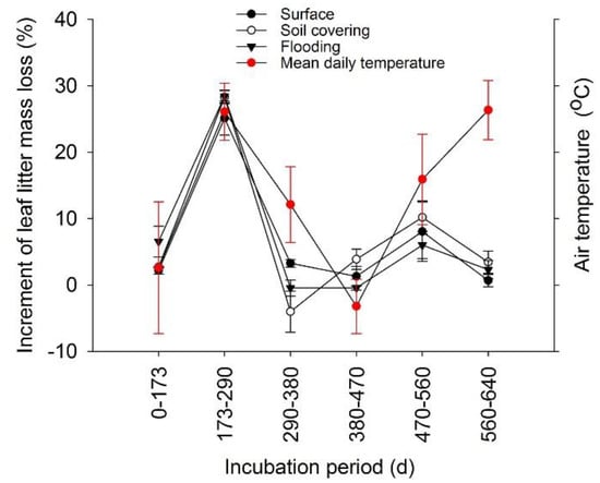 Temperature and moisture constitute the most important controls on litter mass loss [,]. In this study, the increment of leaf litter mass loss for a period of incubation time exhibited a change in trend similar to air temperature within 0–560 d, but the trend was reversed within 560–640 d in the three treatments (Figure 10). Further, there was also a similar exponential growth equation between the increment of leaf litter mass loss (y) and mean daily air temperature (Figure 11) within 0–560 d, and R2 of surface, flooding and soil covering treatments were 0.99, 0.92 and 0.85, respectively, indicating that the leaf litter mass change was correlated with air temperature. Moreover, there was no significant difference in leaf litter mass loss at 173 d among the three treatments (Figure 5), indicating that light radiation, flooding, and soil covering may have the same or no effect on decomposition of litter during the period from 0–173 d at low air temperatures (−10 °C < air temperature <10 °C) []. At 290 d, a significant difference was found between the surface treatment and the flooding treatment, which means that the transient flooding disturbance experienced by litter has a significant impact on decomposition of litter at high air temperatures (10 °C < air temperature <30 °C) []. Therefore, we inferred that temperature affects leaf litter decomposition within 0–560 d incubation time, and temperature has a weak or no effect on leaf litter decomposition after 560 d.
