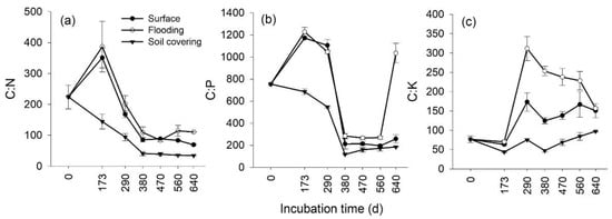 Dynamic variations of C:N (a), C:P (b), and C:K (c) ratio with incubation time in three treatments. Surface: litterbags placed on the ground; flooding: litterbags fixed on the ground and immersed in water for 5 h; soil covering: litterbags covered with soil. Vertical bars denote the standard error of the mean (n = 3).
