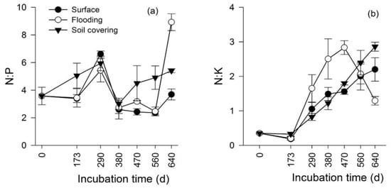 The N:P of leaf litter fluctuated similarly with increasing incubation time in the three treatments (Figure 9). Within 0–380 d, the change of N:P in the three treatments was similar. A difference of N:P change trend occurred within 380–560 d, and the N:P in the soil covering treatment was higher than that in the surface and flooding treatments within 0–560 d, and was highest in the flooding treatment at 640 d (Figure 9a). The N:K of leaf litter fluctuated similarly with increasing incubation time in the surface treatment and soil covering treatment. The N:K of leaf litter in the flooding treatment was higher than that in the surface and soil covering treatments within 173–470 d, but lower than that in the surface and soil covering treatments within 470–640 d (Figure 9b).