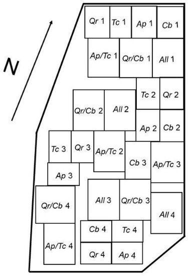 All work was carried out at the B-Tree experimental site (48°19′03.2″ N 16°04′01.0″ E) which is part of the TreeDivNet platform, a worldwide network of tree biodiversity experiments [46]. The B-Tree site was established in 2013 with the tree species Acer platanoides L. (Ap), Tilia cordata Mill. (Tc), Quercus robur L. (Qr), Carpinus betulus L. (Cb), representing a typical warm low-land forest composition. The trees were planted at a density of 10,000 trees ha−1 in a hexagonal pattern, which ensured a 100 cm spacing between all adjacent trees. No thinning or any other treatment has been carried out to date. The tree species were planted in both polycultures and monocultures in four blocks (Figure 1). The mixed stands consist of two species polycultures Ap and Tc (ApTc) or Qr and Cb (QrCb), or a four species (All) polyculture. In two species polycultures, each species contributes 50% of the total number of trees; in the four species plots, each species contributes 25% of the total number of trees. Every combination and monoculture has four replicates, and the replicates are rotated within each block to ensure no one species has a similar position in the blocks. The plot sizes are 81 m2 for single species plots and 196 m2 for two and four species plots (Figure 1). At the time of planting, the saplings were ca. 30–40 cm high. At the time of sampling in September 2020, the mean heights of the trees were 5.5 ± 1.6 m (A. platanoides), 3.6 ± 1.2 m (T. cordata), 4.2 ± 1.1 m (Q. robur) and 4.1 ± 1.0 m (C. betulus). The surrounding area of the B-Tree site is mainly agricultural farmland.