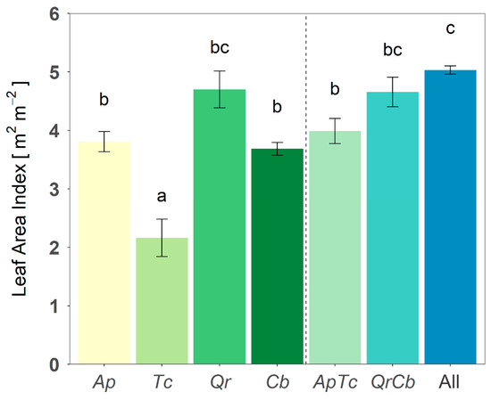Figure 2. Differences in mean Leaf Area Index (LAI) in m2·m−2 of monocultures (Ap, Tc, Qr, Cb), two species polycultures (ApTc, QrCb) and a four species polyculture (All) consisting of the four species Acer platanoides (Ap), Tilia cordata (Tc), Quercus robur (Qr), Carpinus betulus (Cb). Each bar represents the mean LAI of four replicates. Error bars refer to the standard error (SE) of the mean. Letters mark significant differences of the mean LAI between compositions (Table 1). Significant differences in the monocultures occurred only between T. cordata and the other species, see Table 1.