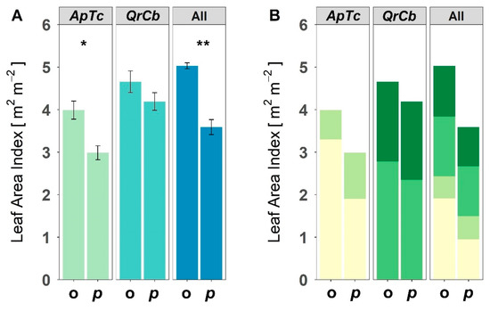 Figure 3. (A) Observed (o) and predicted (p) leaf area index (LAI) and (B) the contribution of each species to the LAI in two species polycultures (ApTc, QrCb), and the four species polyculture (All) of the four species A. platanoides (Ap), T. cordata (Tc), Q. robur (Qr), C. betulus (Cb). Shown are means and standard error of the LAI. Asterisks show significant differences determined using an unpaired t-test (* p < 0.05; ** p < 0.01).