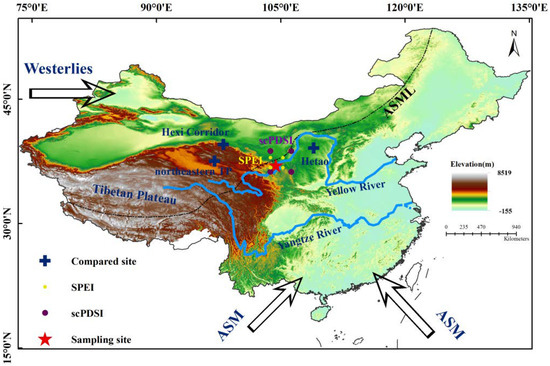 - Yang, B.; Kang, S.; Ljungqvist, F.C.; He, M.; Yan, Z.; Qin, C. Drought variability at the northern fringe of the Asian summer monsoon region over the past millennia. Clim. Dyn. 2014, 43, 845–859. [Google Scholar] [CrossRef]