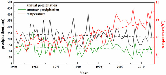 Mean annual precipitation, summer precipitation, and average annual temperature for the Jingyuan meteorological station during the period 1951–2015 CE. The dashed line indicates linear trend.