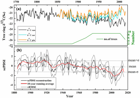 (a) shows tree-ring δ13Craw series derived from raw data, corrected tree-ring δ13Ccor based on the method of [23], and tree-ring δ13Cpin based on the method of [37]. (b) shows reconstructed annual scPDSI values for June (previous year) to May (current year) for the period from 1884 to 2015 CE. RMSE is the root mean square error.