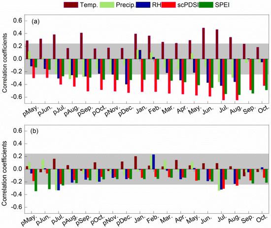 Correlation coefficients for tree-ring δ13C (a) and δ18O (b) series with temperature, precipitation, relative humidity, scPDSI, and SPEI from June each year to October of the following year during the period from 1951 to 2015. Grey shaded bands indicate the 95% confidence level.