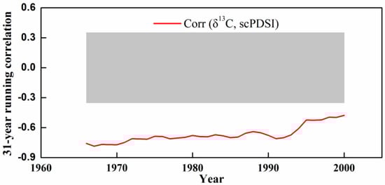 The 31-year running correlations between tree-ring δ13C chronology and scPDSI with significant ones at 95% confidence level expressing as falling outside of grey shading.