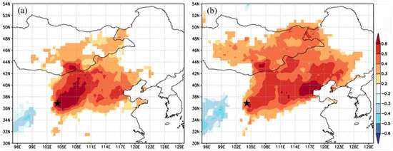 Spatial correlation results between reconstructed (a) and instrumental (b) scPDSI values with UCAR scPDSI collected from the period 1951 to 2015. The black star represents sampling site. Significant correlations at the 90% level are marked.