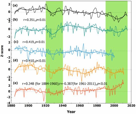 Figure 8 shows a significant negative (p < 0.01) spatial correlation between our scPDSI reconstruction and sea surface temperature (SST) in the Indian Ocean, South China Sea, Pacific Ocean, and Atlantic Ocean during 1951–2015. These correlations indicated that moisture conditions in our study region were directly associated with large-scale ocean-land circulation systems. We found significant correlation coefficients between the South Asian Summer Monsoon index [52], East Asian Summer Monsoon index (EASM) [53], PDO index [54], and instrumental summer NAO (https://climexp.knmi.nl/; accessed on 5 November 2021) with our reconstruction of 0.23 (p < 0.05, n = 117 for 1884–2000 CE), 0.22 (p < 0.05, n = 117 for 1884–2000 CE), −0.21 (p < 0.05, n = 132 for 1884–2015 CE), and 0.25 (p < 0.01, n = 129 for 1884–2012 CE), respectively.Further work is required to explore the nature and stability of these teleconnections.