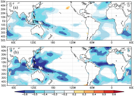 Spatial correlation coefficient of the reconstructed scPDSI (a) and a 10-year running average scPDSI value (b) with the SST over the common measurement period from 1951 to 2014. Significant correlations at the 90% level have been marked.