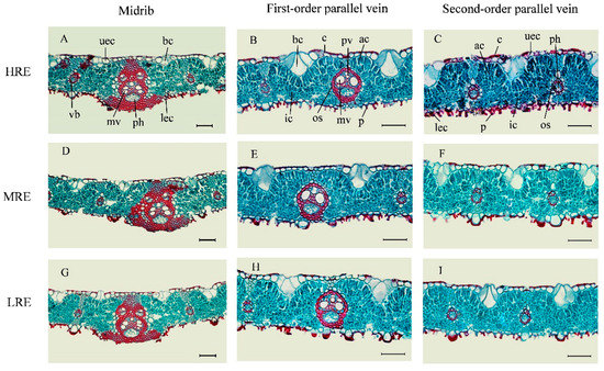 The leaf vessels in HRE were significantly greater in diameter than those in MRE and LRE (p < 0.05), irrespective of vessels from the midrib, first-order parallel vein or second-order parallel vein (Figure 4a). Likewise, the vascular bundle diameter of leaf first-order parallel vein and second-order parallel vein in HRE were greatest in the three habitats. As to the vascular bundle diameter of the midrib, the values of HRE and LRE were significantly higher than that of MRE (p < 0.05) (Figure 4b).
